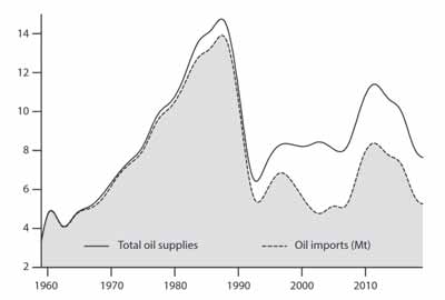 图1.古巴原油及石油衍生物的供应情况(1959-2019年)。数据来源:国家统计局《革命时期的能源统计》表14、25;国家统计和信息局《2014年古巴统计年鉴》表10.4、10.7;《2019年古巴统计年鉴》表10.3、10.6;《2020年古巴统计年鉴》表10.3、10.6。
